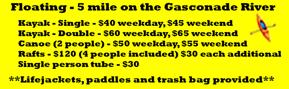 This relaxing 5 mile float is on the scenic Gasconade River which features beautiful bluffs and cooling waters. Our Float times are 9am, 11am, 1pm
